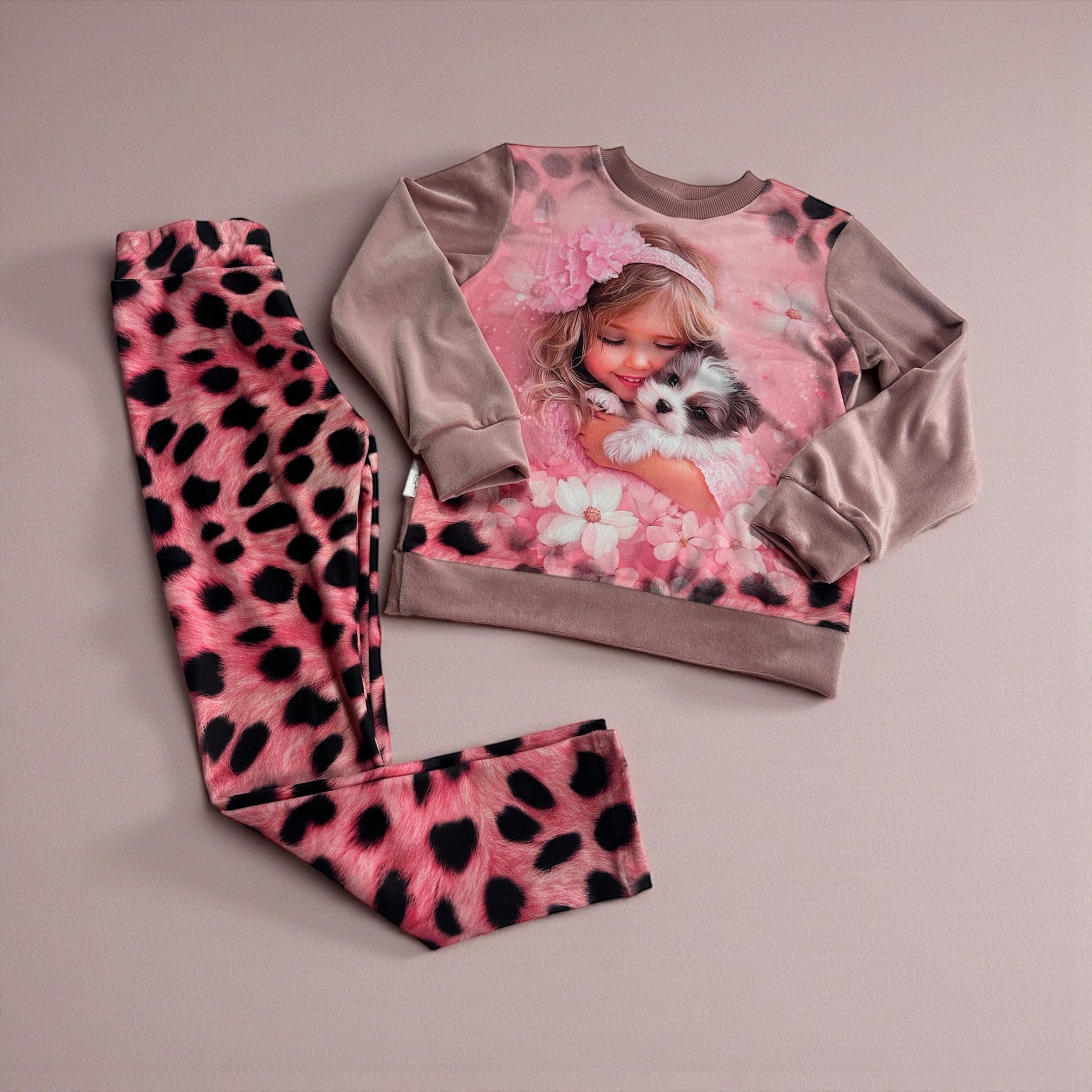 Leiskite mažajai pasijausti ypatingai su šiuo minkštu ir jaukiu mergaitišku kostiumėliu, pasiūtu iš aukštos kokybės soft veliūro. Komplektą sudaro švelni džemperio tipo palaidinė ir tamprės su žaismingu rožiniu raštu – idealu tiek kasdienai, tiek fotosesijoms ar darželiui.