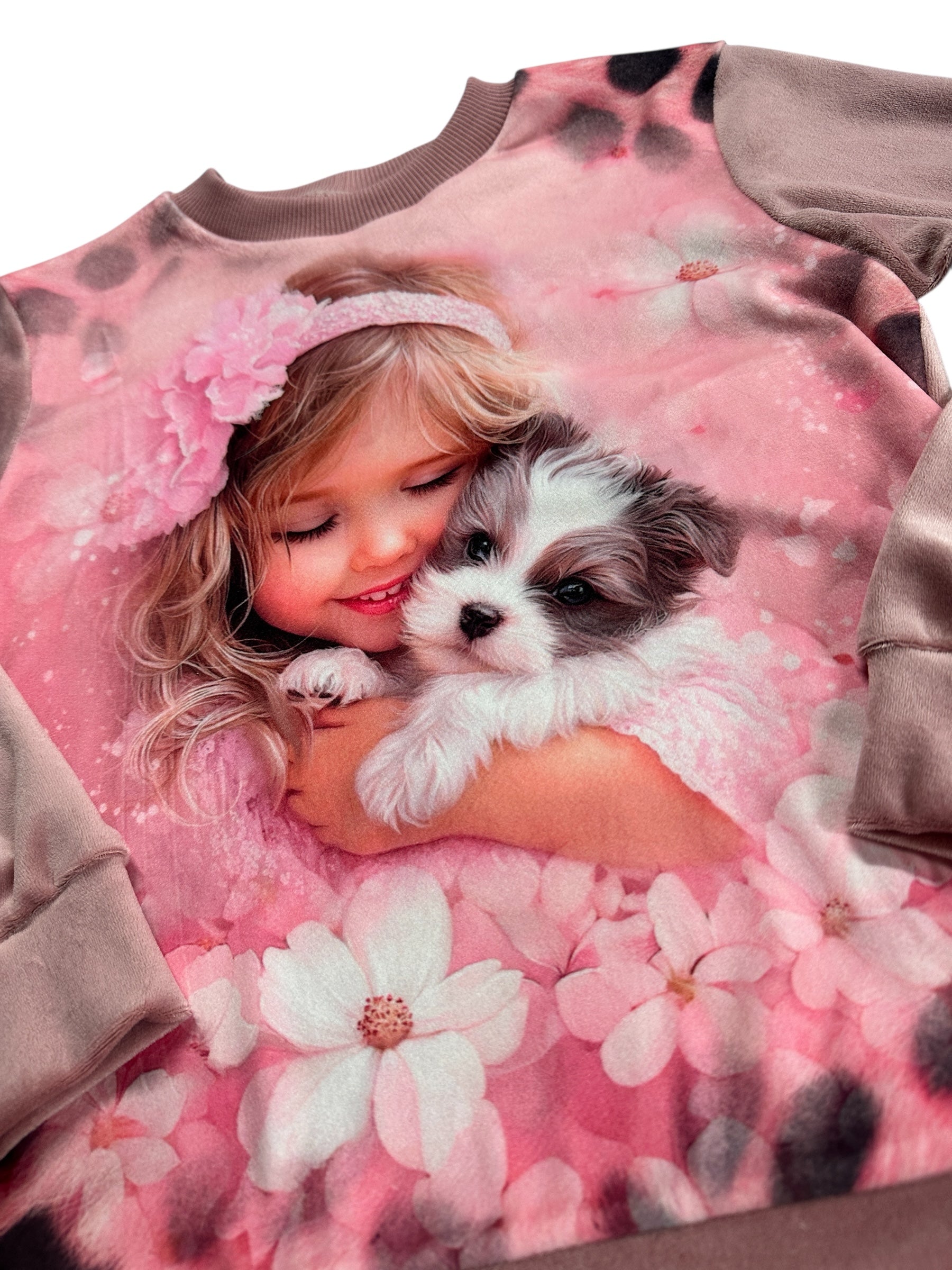 Džemperis dekoruotas mielu mergaitės ir šuniuko piešiniu, kuris suteikia išskirtinumo ir džiaugsmo kiekvienai dienai.