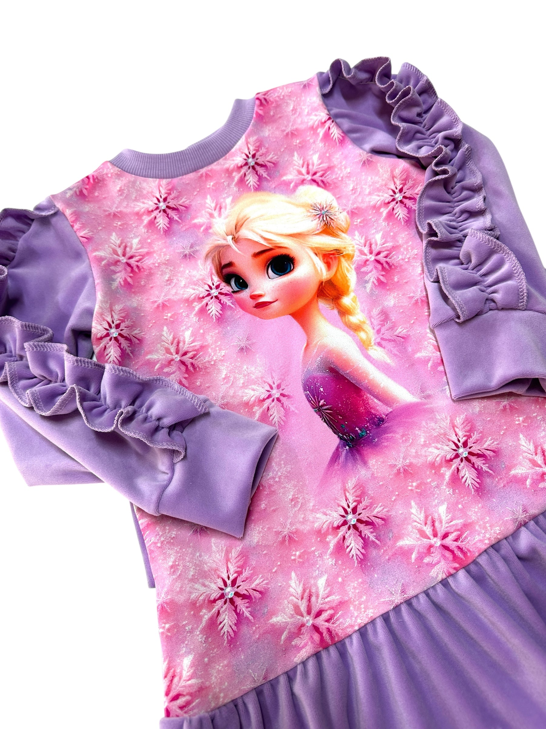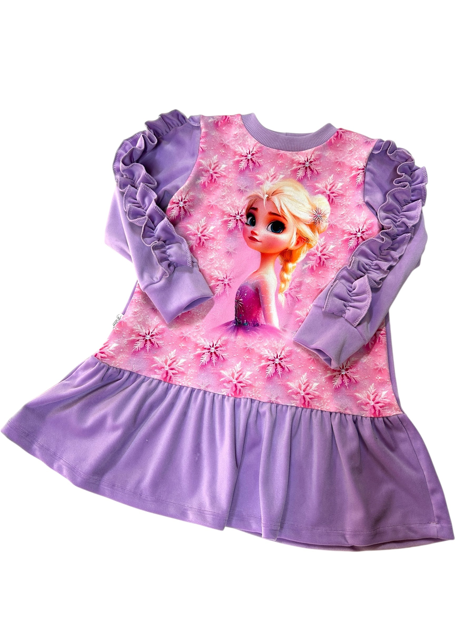 Ši išskirtinė mergaitiška suknelė sukurta mažosioms princesėms, kurios mėgsta svajoti ir puoštis. Viršutinė dalis pasiūta iš minkšto kilpinio trikotažo su žaismingu personažo motyvu, kuris iškart pavergia mergaičių širdis. Apačia ir vienspalvės rankovės iš minkšto soft veliūro suteikia jaukumo ir prabangos pojūtį.