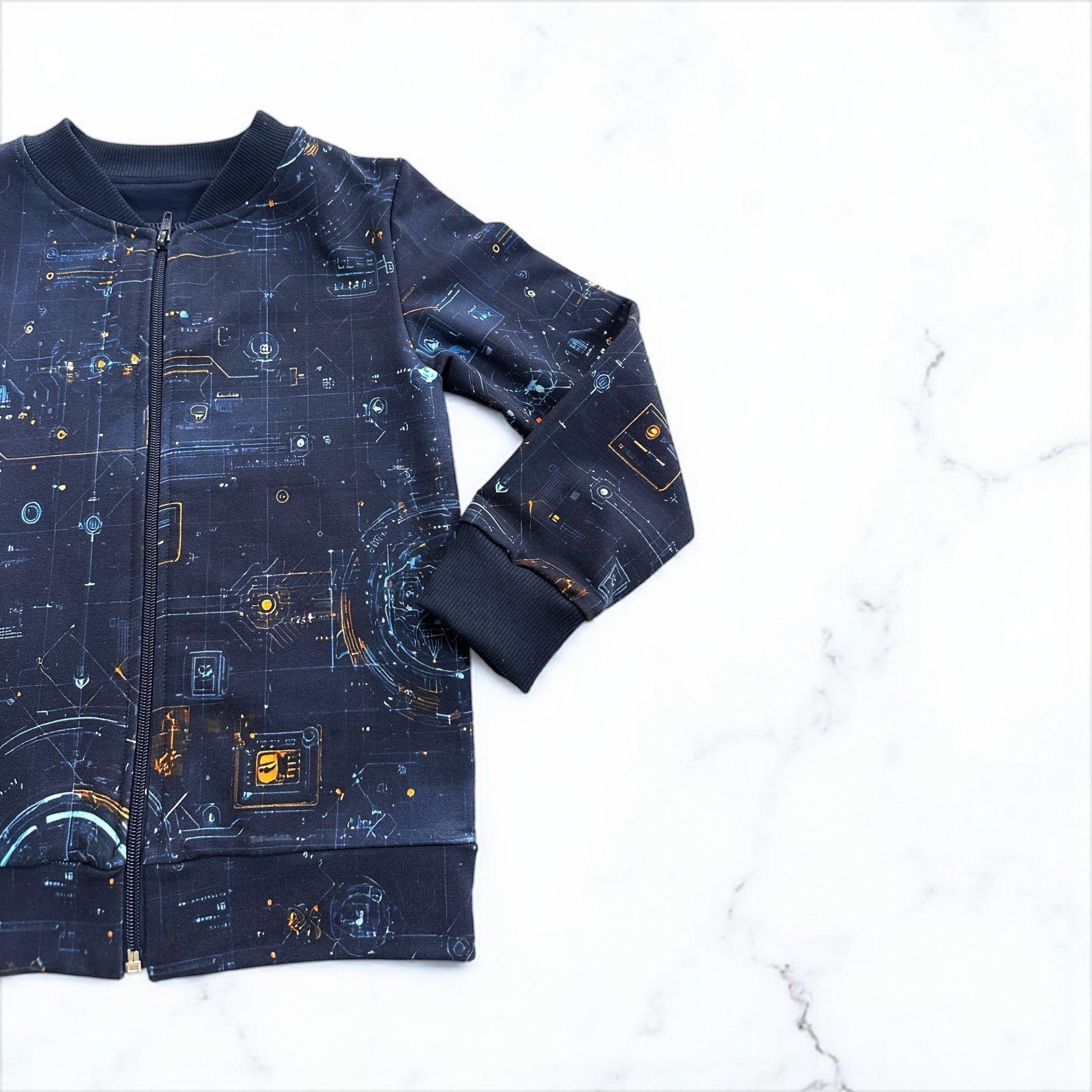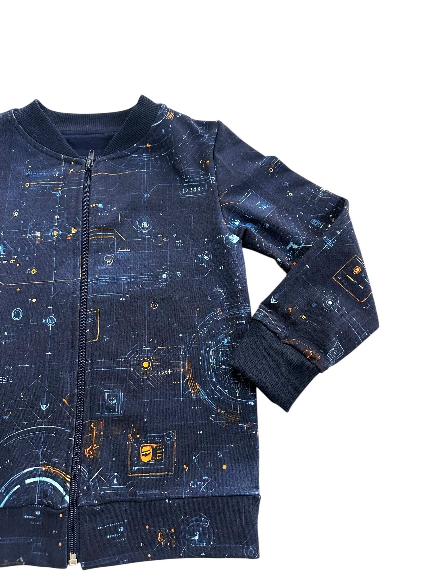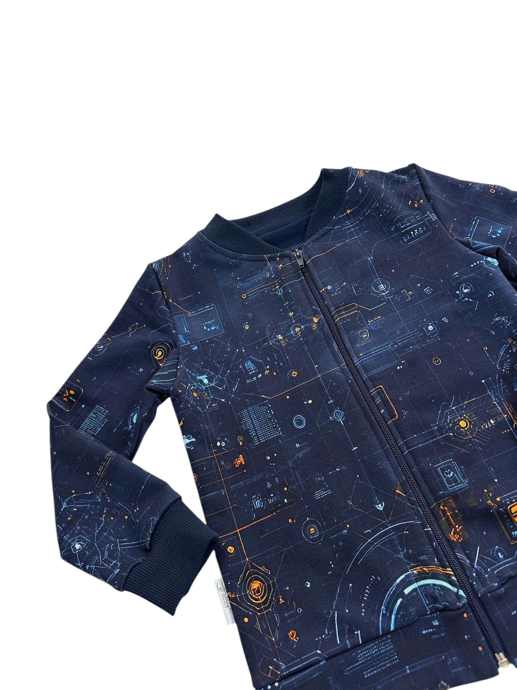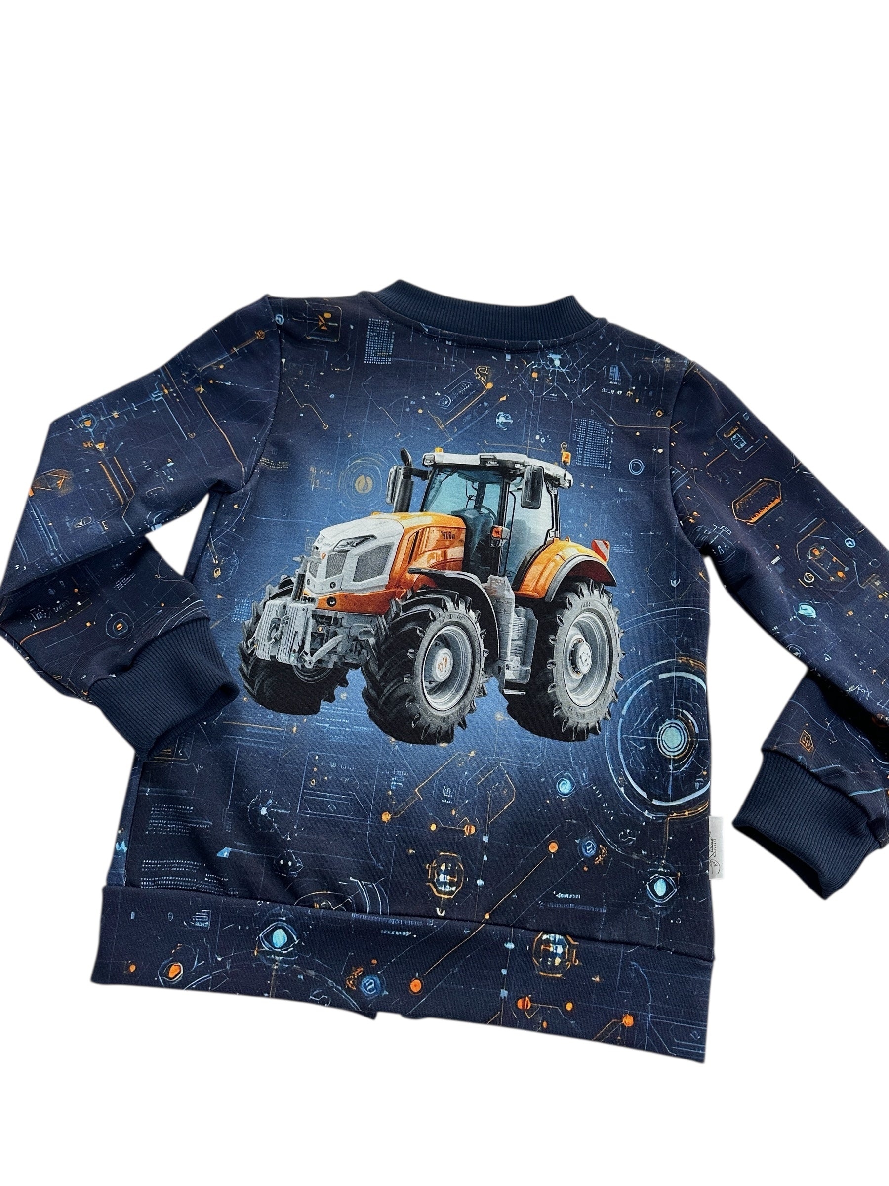 Šis rankų darbo džemperis – tikra svajonė mažiesiems technikos gerbėjams! Pasiūtas iš sertifikuoto skaitmeninės spaudos kilpinio trikotažo, jis ne tik jaukus, bet ir saugus vaiko odai. Džemperio priekis užsegamas patogiu užtrauktuku, o nugarinėje dalyje – visų berniukų mylimas traktoriaus motyvas, kuris suteikia žaismingumo ir išskirtinumo.