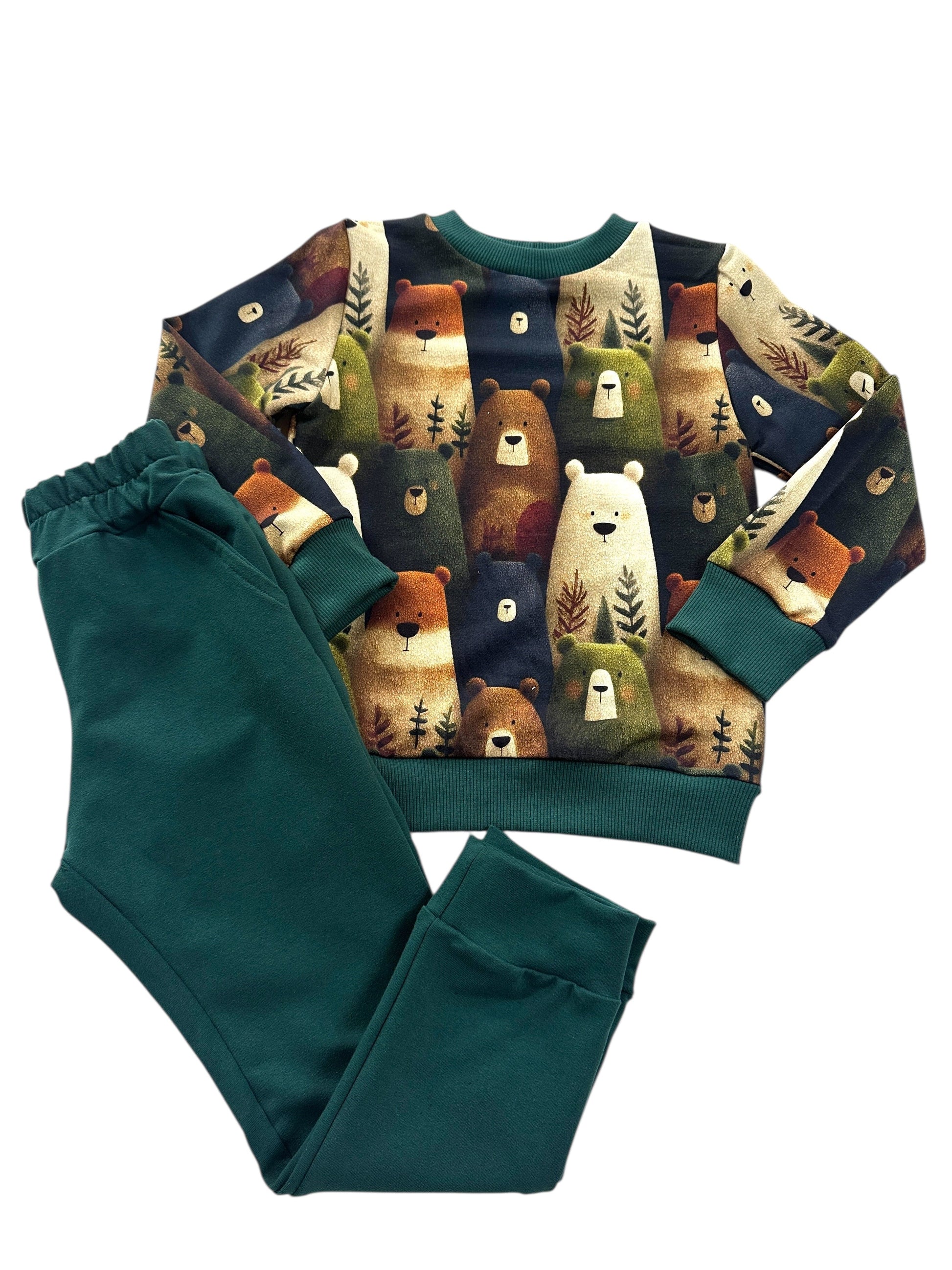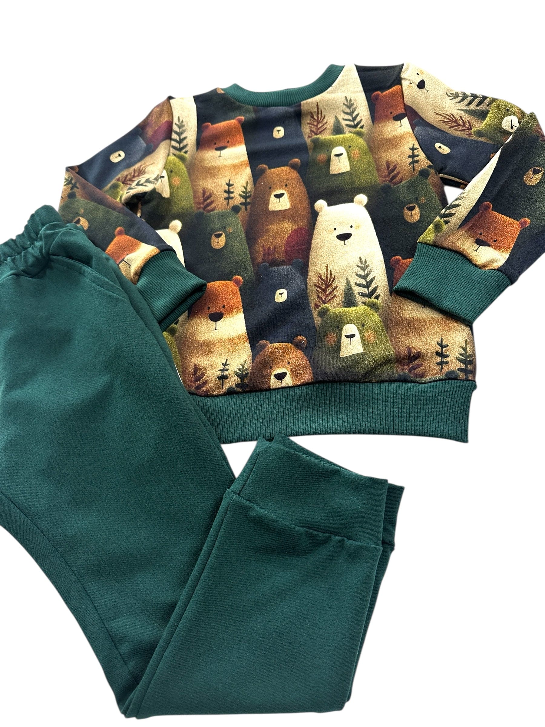 Džemperiukas pasiūtas iš ypatingai minkštos ir kokybiškos skaitmeninės spaudos medžiagos, puoštas linksmų meškiukų raštu. Meškiukai sukuria rudenišką, raminančią nuotaiką, o tamsiai žalios kelnės idealiai papildo visą derinį.